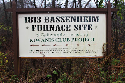 The pile of stones we visited, The Bassenheim Furnace was built in 1813 by Dr. Detmar Basse, the founder of Zelienople. It produced iron for about 10 years before it shut down. The quality of the iron it produced was good. The near-by forests provided charcoal to fuel it and limestone was procured from a cliff about a mile to the north. The ore came from local sources also.