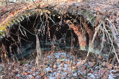 Snow hid a lot from us but we did find some slag and that indicted that a furnace had sat near here at some time in the past. In the S&T book they said that the outer stones of this furnace were removed, possibly to help in the manufacture of the New Laurel Furnace, a mile or two further downstream. Looking at what we had found, we were pretty sure that this mound was all of what is left of the Old Laurel Furnace. The Old Laurel Furnace had been built in 1797, two hundred and twenty-seven years ago!